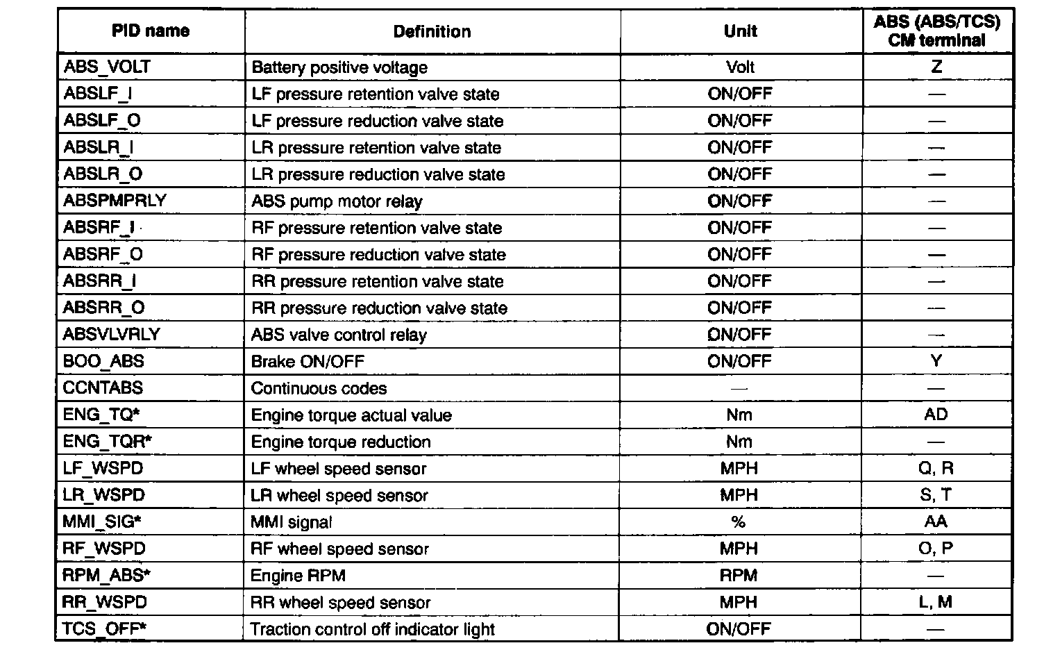 PID/DATA Monitor Table