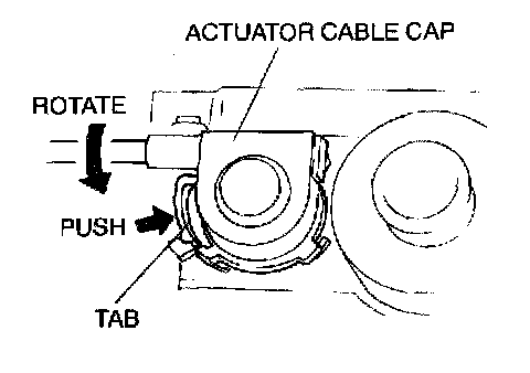 1. Remove the actuator cable cap from the cruise actuator by pushing the tab and rotating the actuator cable cap counterclockwise.