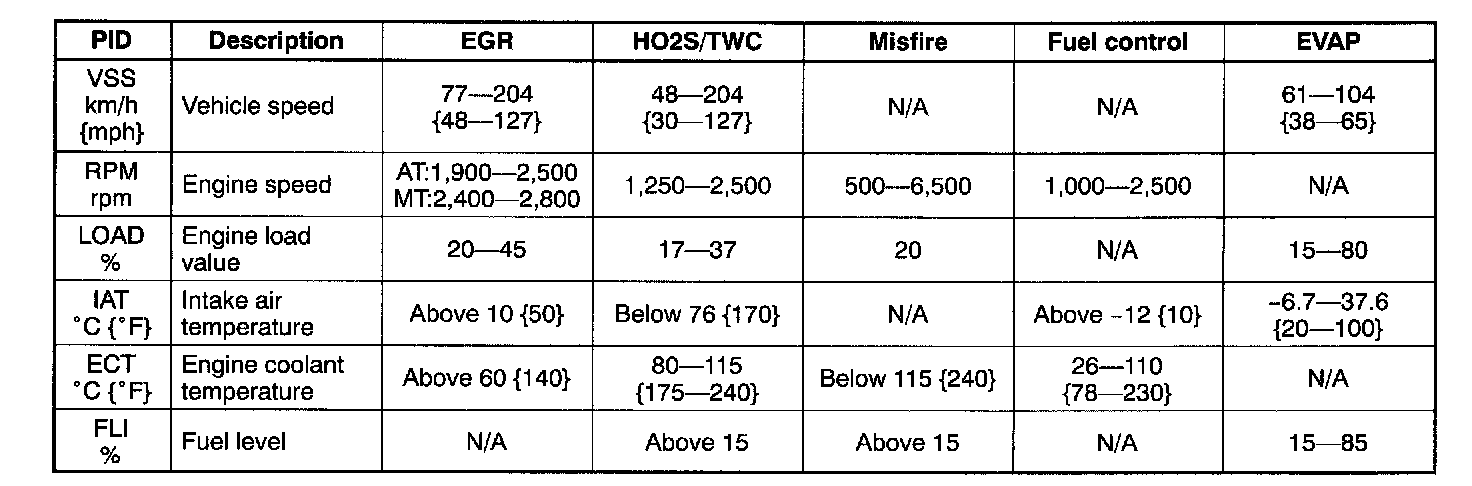 Drive Mode Implementation ConditionEach OBD II system is monitored (for less than 1 minute) when the specifications below are met.