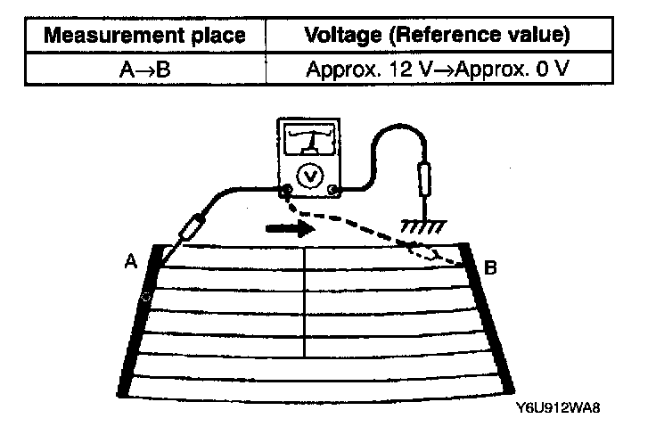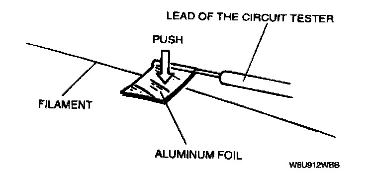 CAUTION: Directly touching the rear defroster filament with the lead of the circuit tester will damage it. Wrap aluminum foil around the end of the lead and test the filament by touching it with the foil.