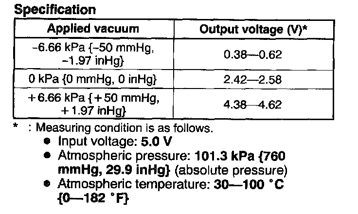 6. Decrease the applied pressure from +6.66 kPa {+50 mmHg, +1.97 inHg} to -6.66 kPa {-50 mmHg, -1.97 inHg} and verify that the PCM terminal 62 voltage decreases accordingly as specified.