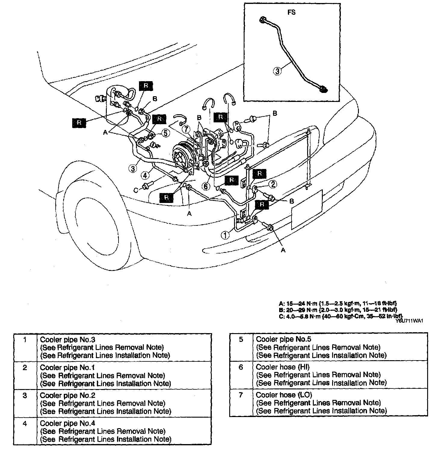 7. Remove the accumulator tank, then remove cooler pipe No.5. (See ACCUMULATOR TANK REMOVAL/INSTALLATION.)