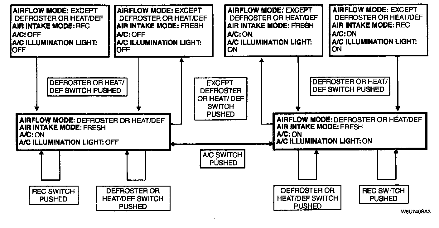 - The defroster control starts when the DEFROSTER or HEAT/DEF switch is turned on. When the defroster control starts, air intake mode and A/C ON/OFF are controlled based on the input signal of each switch.