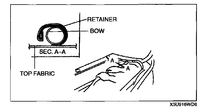 6. Clamp the top fabric to the bow using water pump pliers which have been wrapped in tape. Pull the top fabric by hand to verify that it is held securely.
