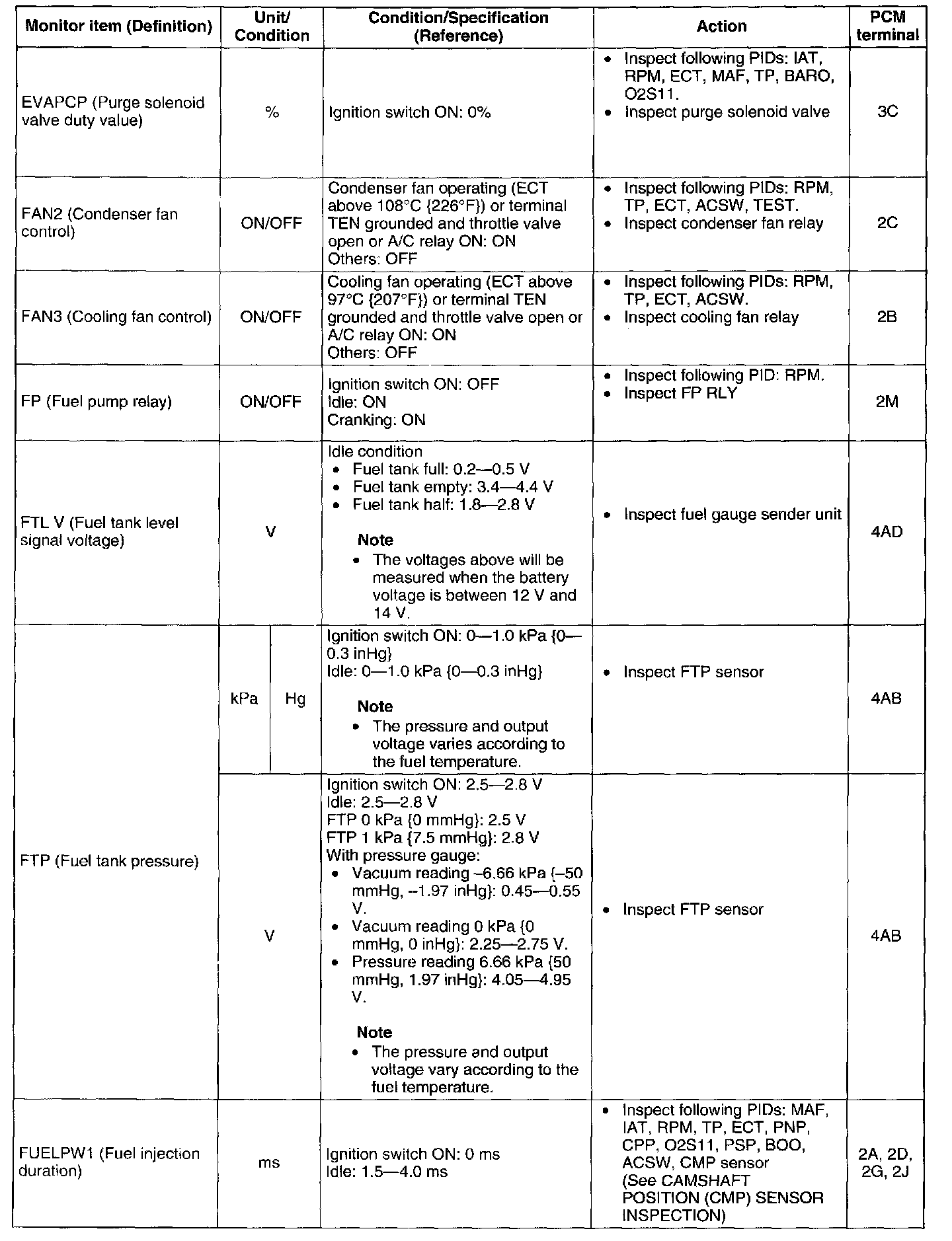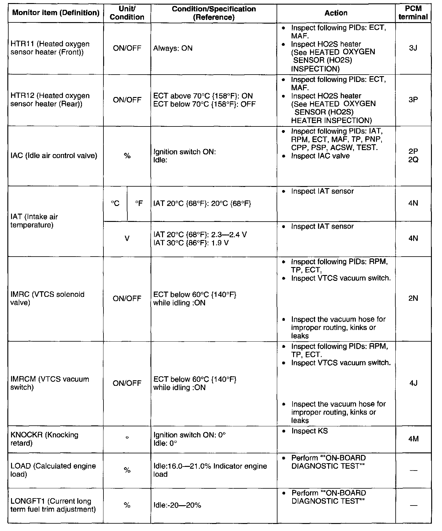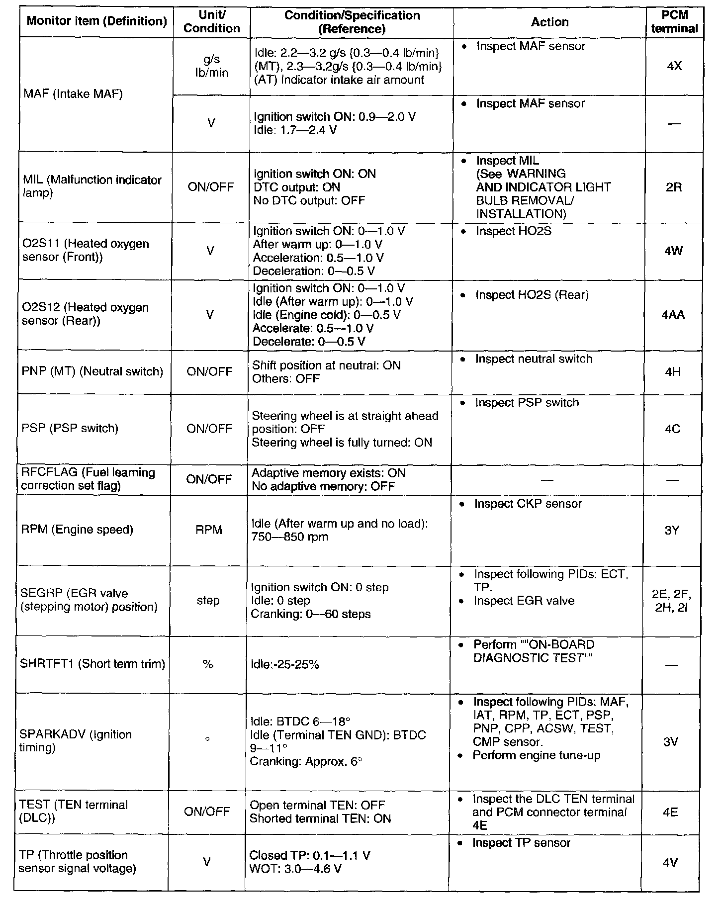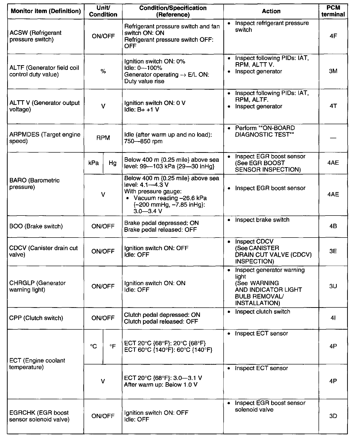 2. Confirm that the following PIDs are within the specifications: