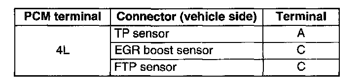 4. Inspect for continuity between the PCM connector (vehicle side) terminal 4L and each sensor connector (vehicle side) terminals to which Vref is applied using an ohmmeter.
