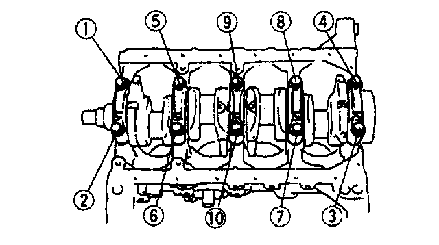 Tighten the main bearing cap bolts in two or three steps in the order shown.