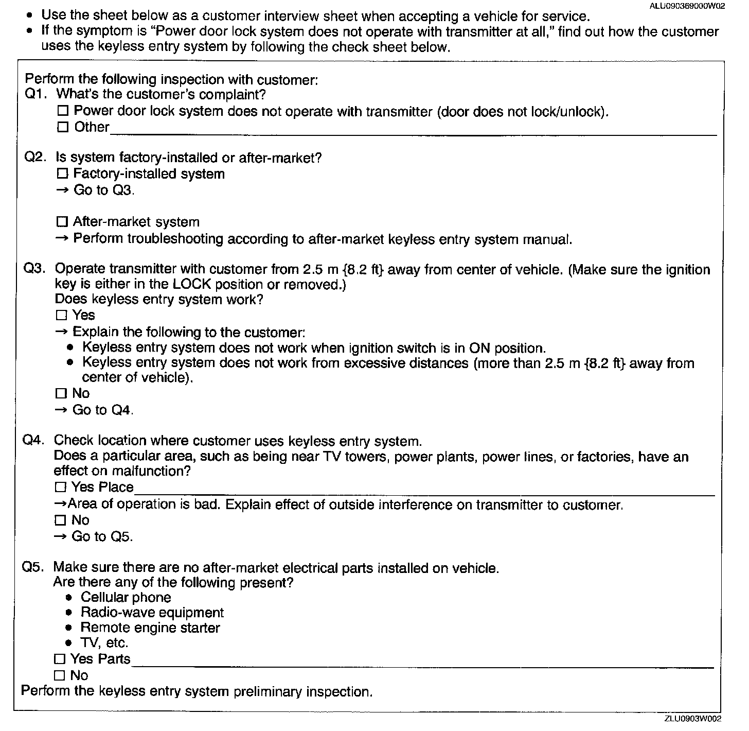 Keyless Entry System Check Sheet: