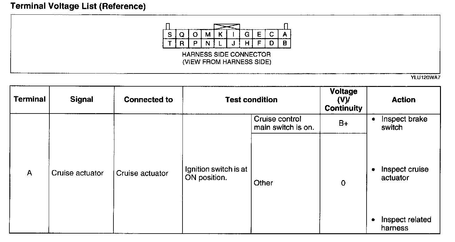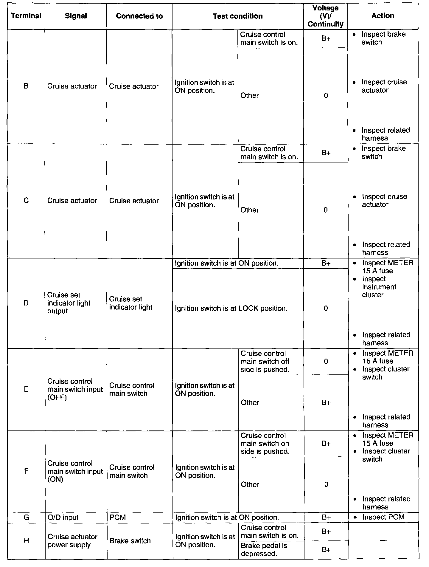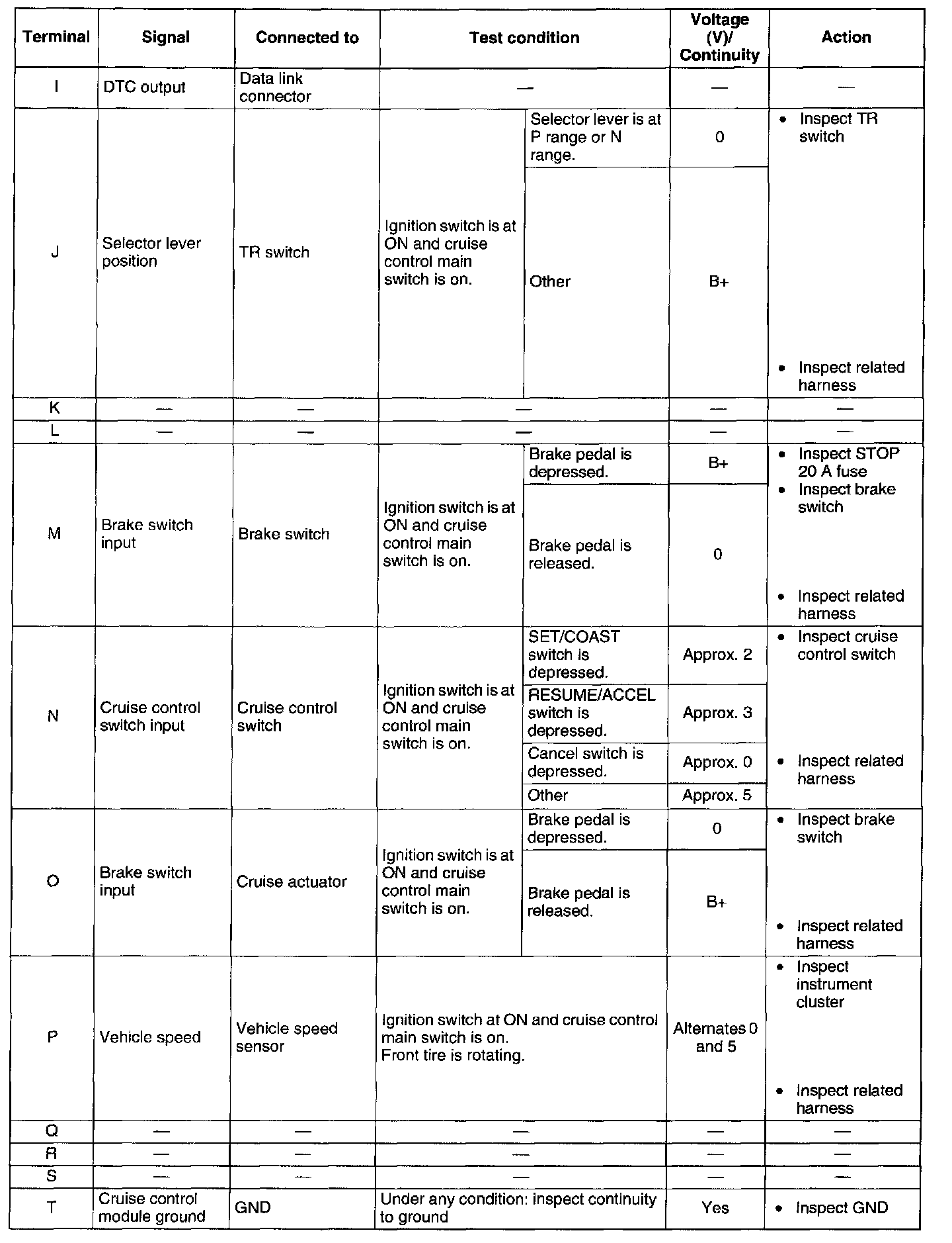 CRUISE CONTROL MODULE INSPECTION1. Measure the voltage at the cruise control module terminals as indicated.