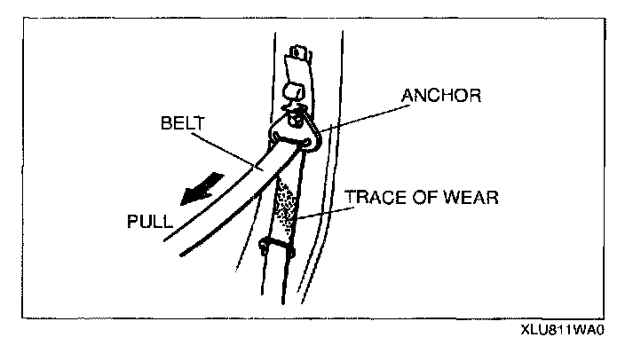 1. If the vehicle has been subjected to a shock in an accident, pull the belt from the retractor and confirm that there is no trace of wear (the load limiter has not operated) by visually inspecting and feeling the belt.
