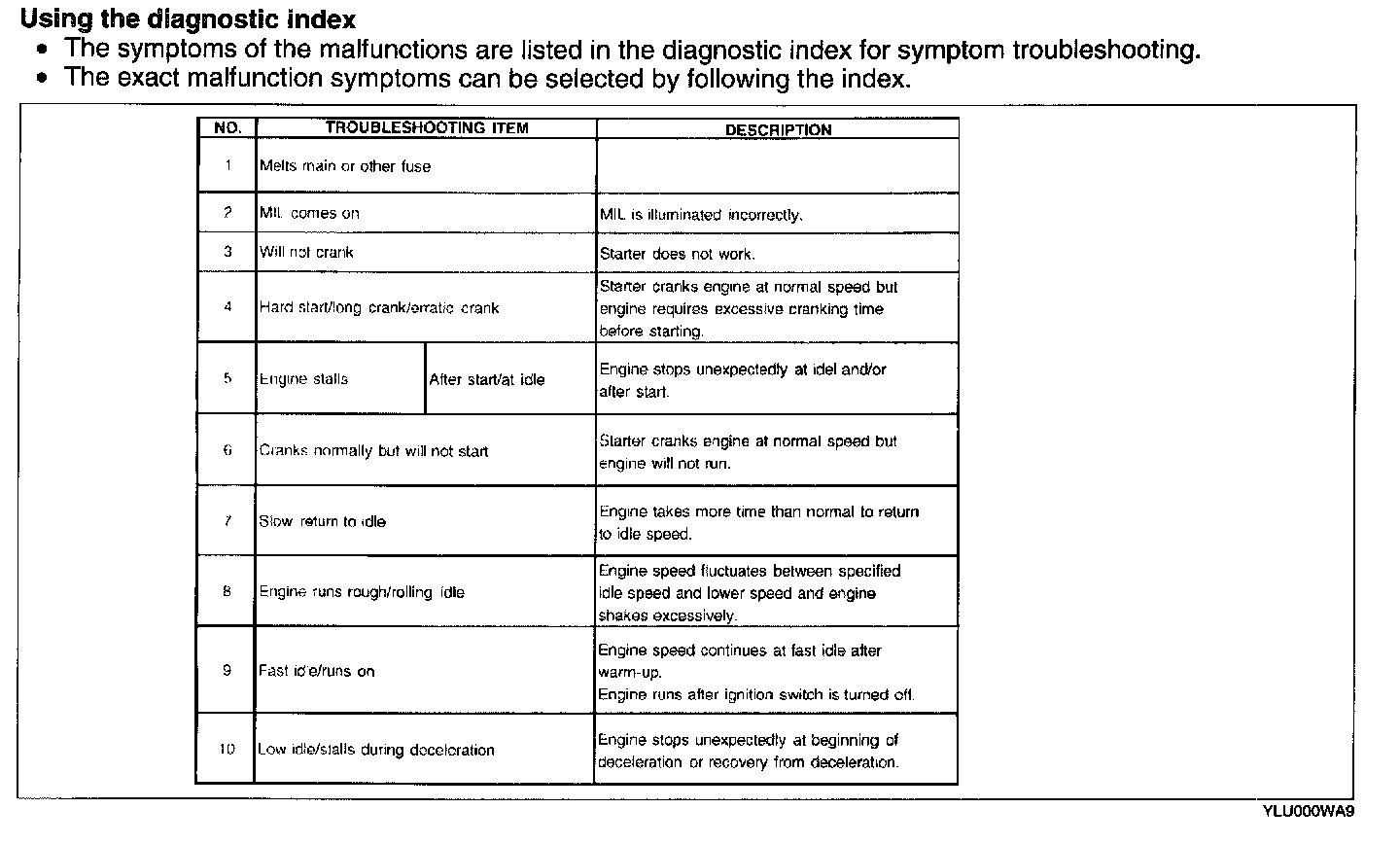 - The diagnostic index lists the symptoms of specific malfunctions. Select the symptoms related or most closely relating to the malfunction.