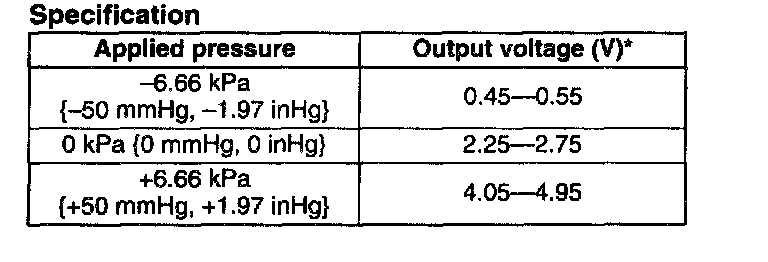 6. Decrease the applied pressure from +6.66 kPa {+50 mmHg, +1.97 inHg} to -6.66 kPa {-50 mmHg, -1.97 inHg} and verify that the PCM terminal 62 voltage decreases accordingly as specified.