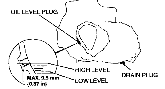 4. Remove the oil level plug and the washer. Add the specified amount and type of oil through the oil level plug hole until the level reaches the bottom of the oil level plug hole.