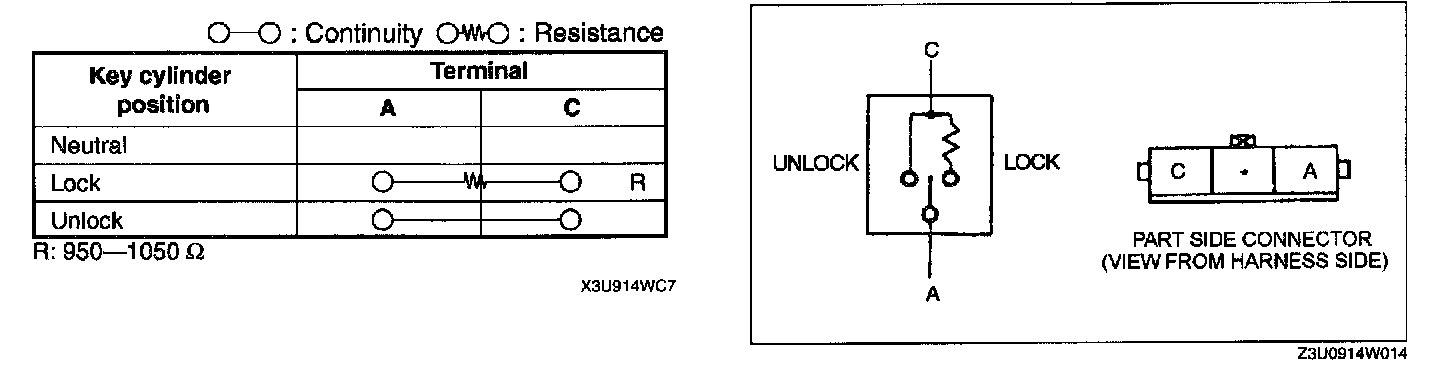 6. Inspect for continuity between the door key cylinder switch terminals using an ohmmeter. If not as specified, replace the door key cylinder switch.