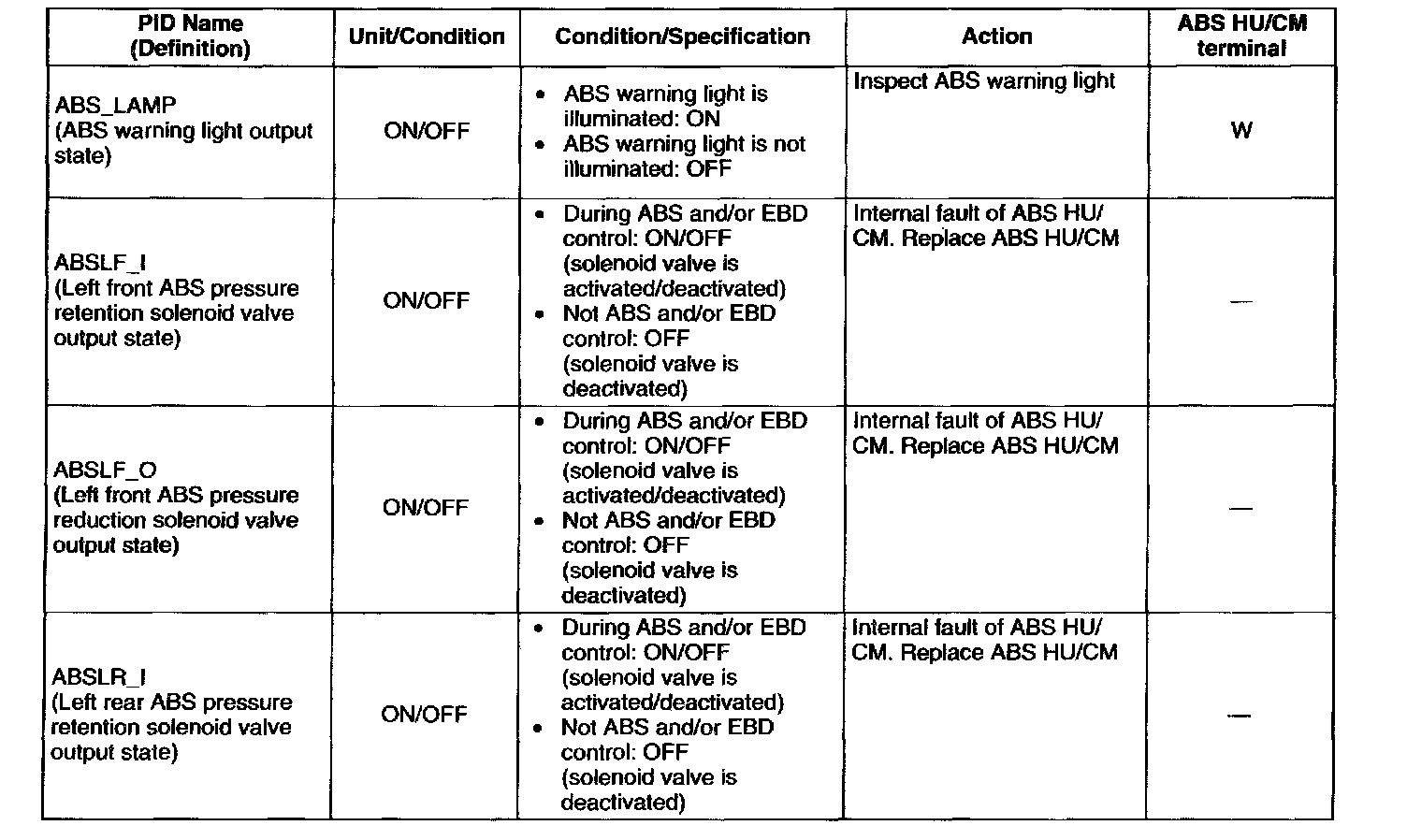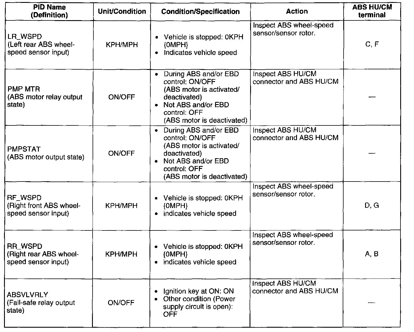 PID/DATA Monitor Table