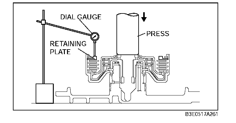 5) Release the compressed air and read the dial gauge when the 3- 4 clutch piston is not operating.