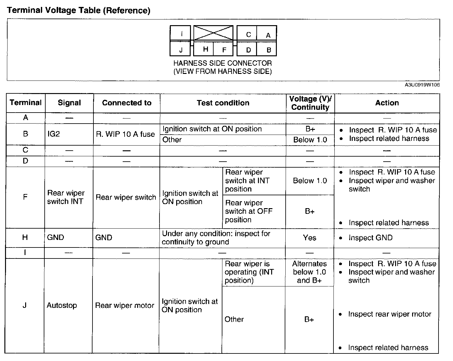 INTERMITTENT REAR WIPER RELAY INSPECTIONTerminal Voltage Table: