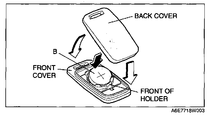 3. Install a new battery (CR2025) into the front portion of the holder with the positive pole (+) facing up. Press on the B portion of the battery to set the battery.