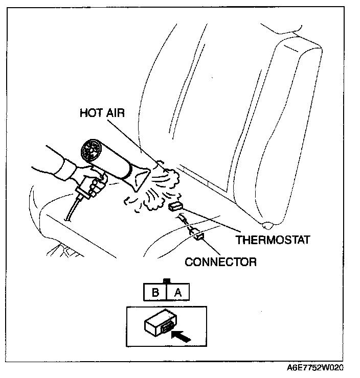 3. While inspecting for continuity between the connector terminals A and B, use a dryer to warm the thermostat of the seat warmer unit on seat cushion.