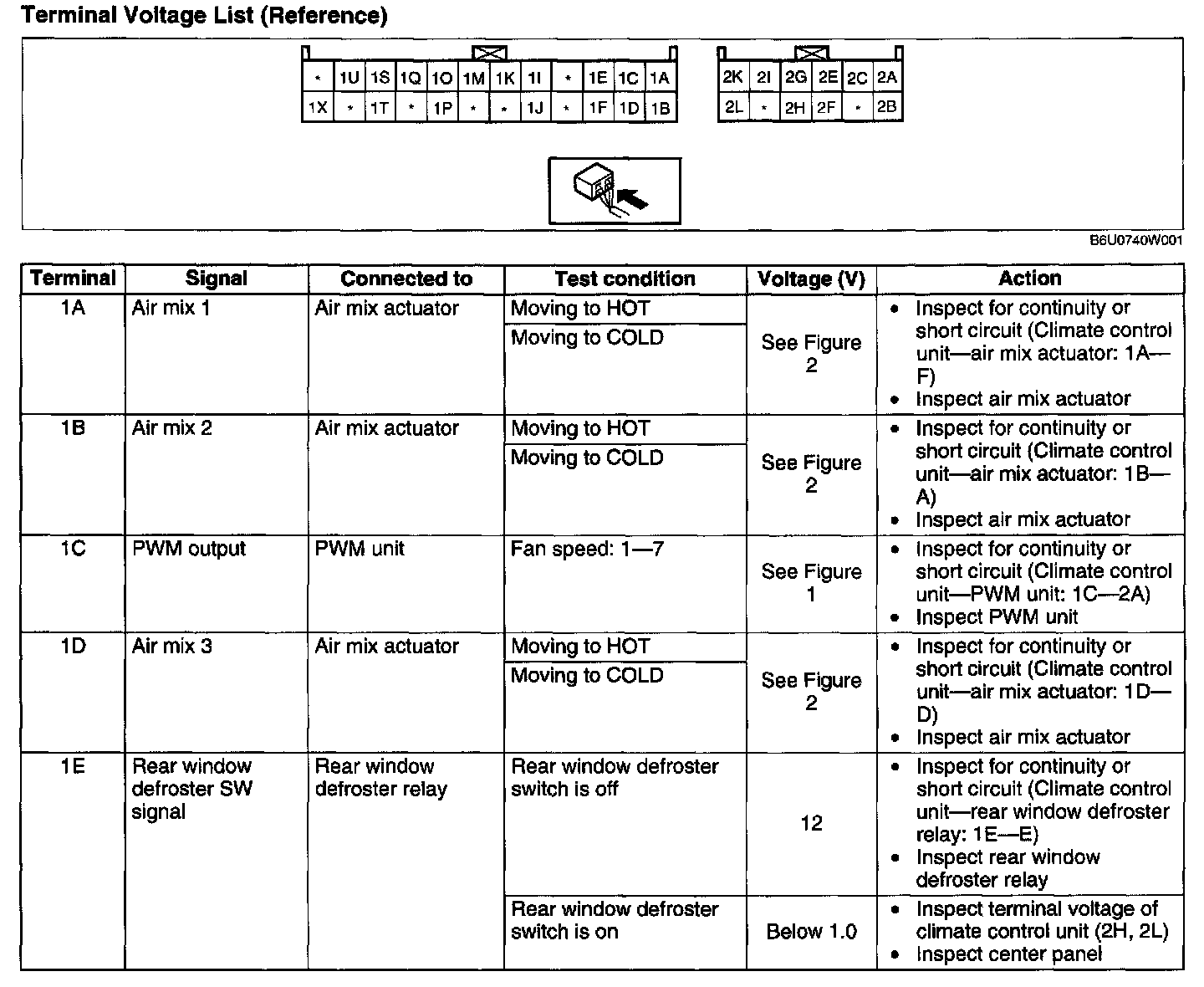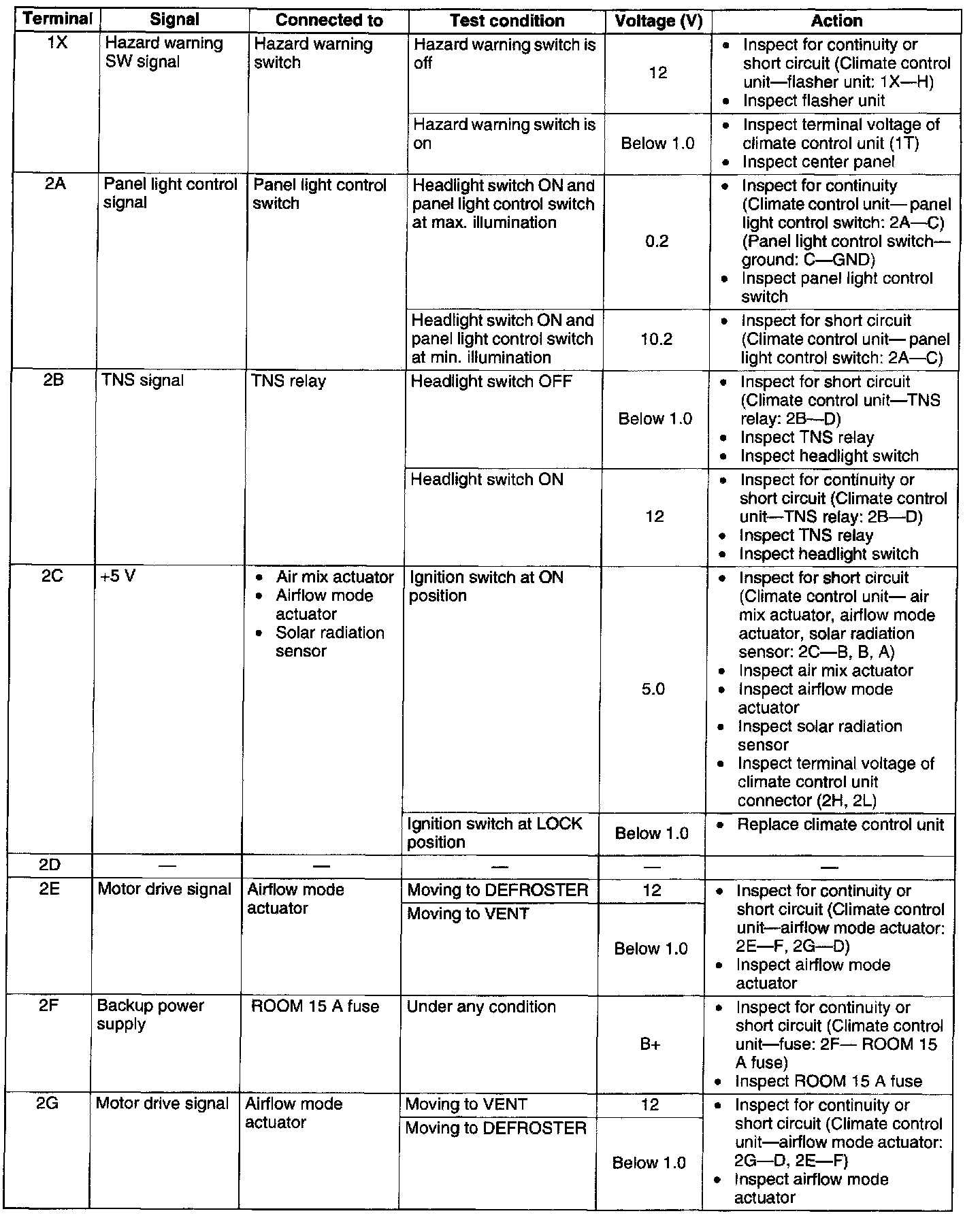 3. Measure the voltage at each climate control unit terminal and refer to the terminal voltage list.