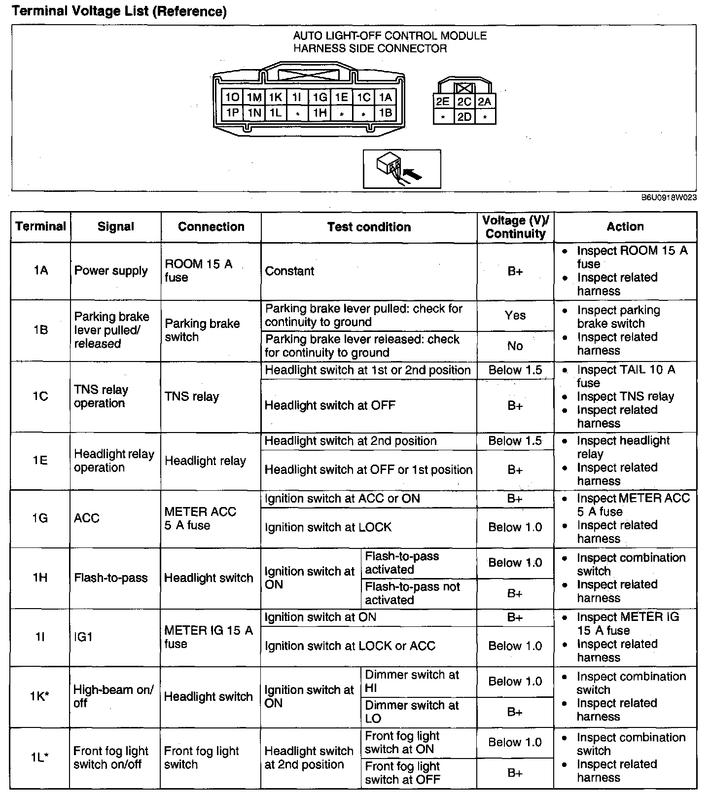 AUTO LIGHT-OFF CONTROL MODULE INSPECTION1. Measure the voltage at the auto light-off control module terminals as indicated below.