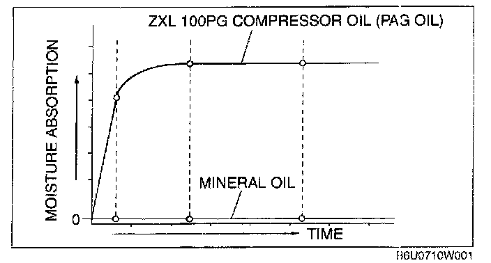 - ZXL 100PG compressor oil (PAG oil) has a higher moisture absorption efficiency than the previously used mineral oil. If moisture mixes with the compressor oil, the refrigerant system could be damaged. Therefore, install caps immediately after using the compressor oil or removing refrigerant system parts to prevent moisture absorption.