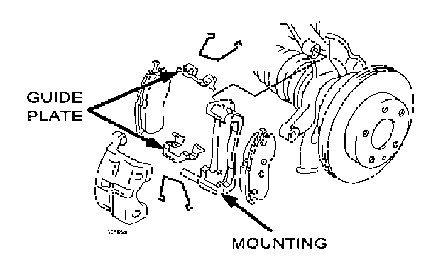 When cold, a sharp METALLIC noise may occur from the front brakes WITHOUT ANY BRAKE APPLICATION while turning or driving at a low speed because the strength of the hooks for the guide plate is insufficient. Generally when it is cold, the pad and guide plate on the front mounting support easily get frozen and move together when the brakes are applied. This causes the guide plate to move out of position and come into contact with the rotor, making a noise.