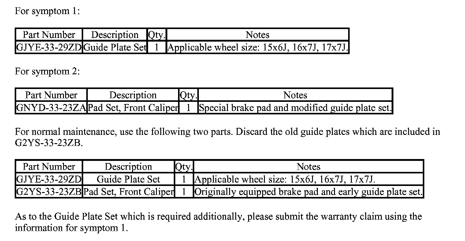 The special pads (GNYD-33-23ZA) may give a different brake pedal feeling after replacement due to a different friction material than original equipped pads (G2YS-33-23ZA). The special brake pads are better for brake noise but it gives a softer brake feeling than the original equipped brake pads, which gives more solid brake feeling.