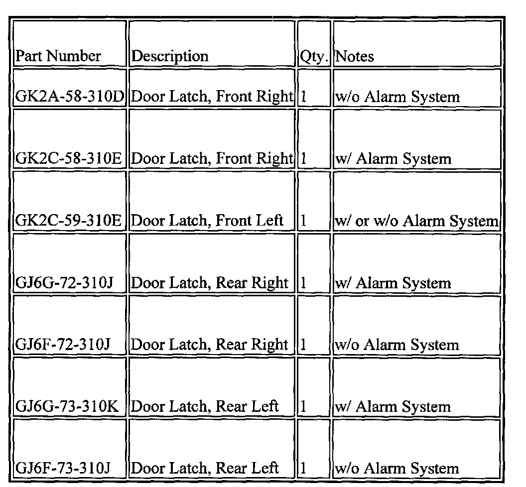 ^ Front Door: Refer to Workshop Manual (Section 09-14) FRONT DOOR LATCH AND LOCK ACTUATOR REMOVAL/INSTALLATION Page 09-14-5.