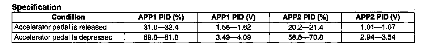 5. Verify that the APP1 or APP2 PID (percentage) is as indicated in the table given according to the condition of the accelerator pedal.