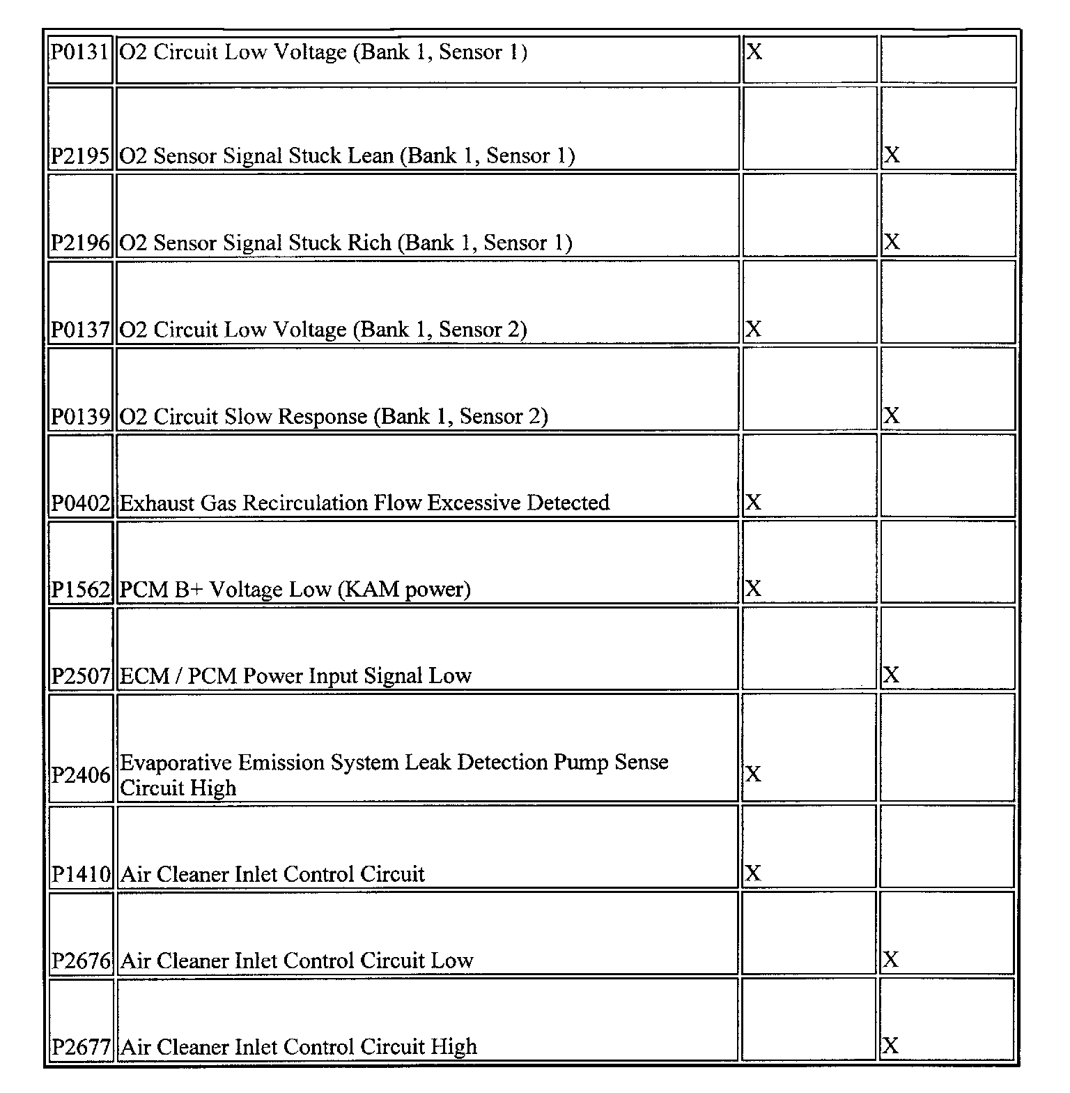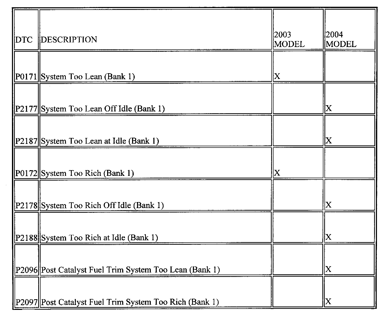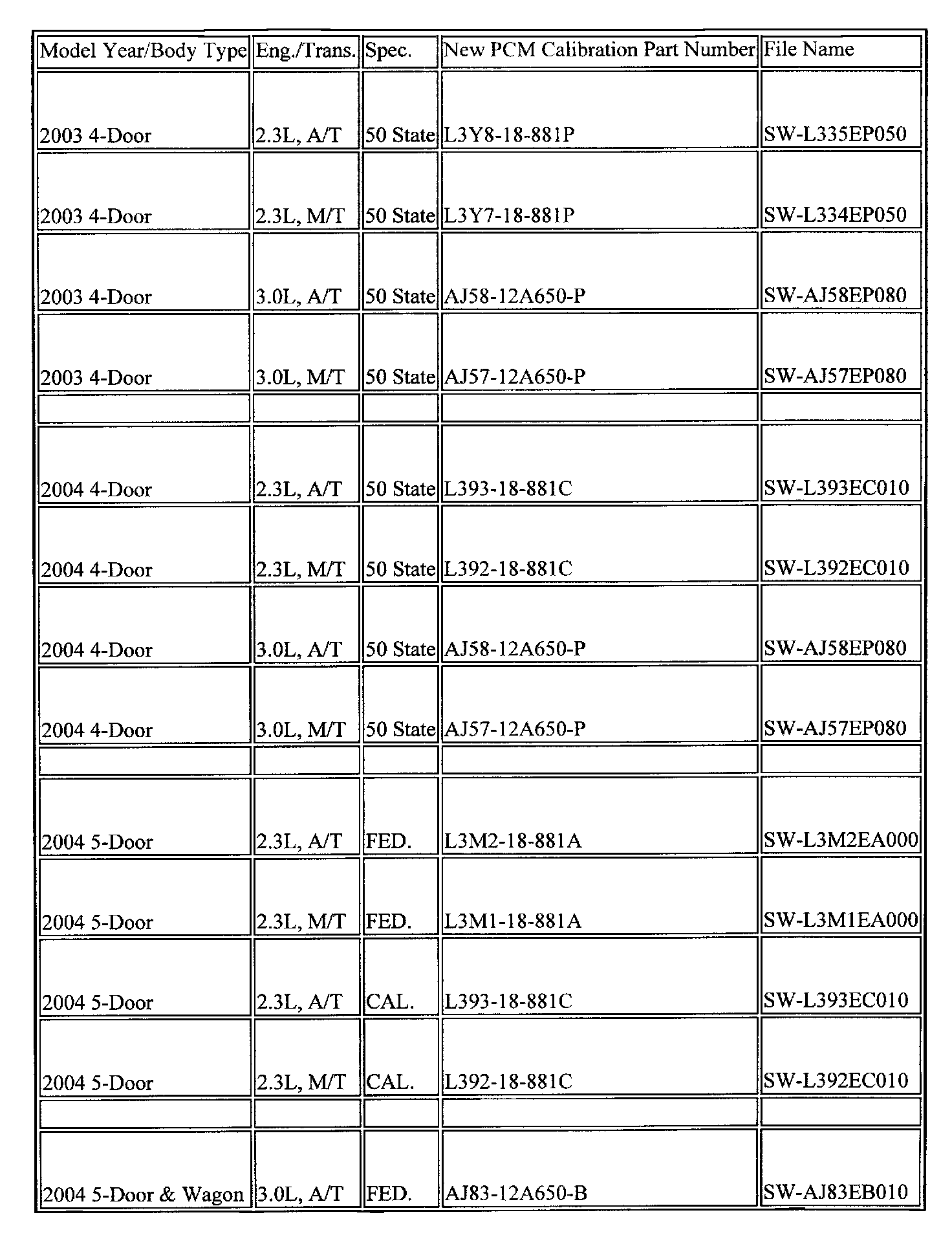 ^ When reprogramming a 2003 Mazda6 2.3L PCM to correct the P2404 and P0456 codes, the reprogramming procedure WILL update the PCM to the 2004 model DTCs listed in the table above.