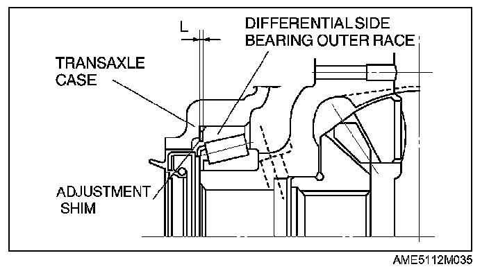 ^ Adjust the differential side bearing preload by measuring clearance L between the transaxle case and the differential side bearing outer race, and selecting a differential side bearing adjustment shim.