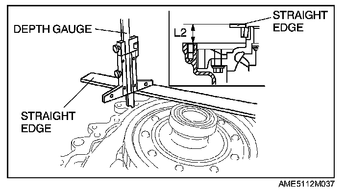 3. Verify dimension L2 between the differential side bearing outer race and the transaxle case installation surface of the clutch housing using a depth gauge and straight edge.