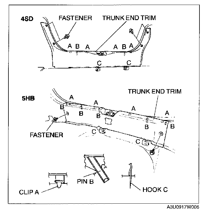 4. Pull the trunk end trim upward, then disengage pins B and C from the body.