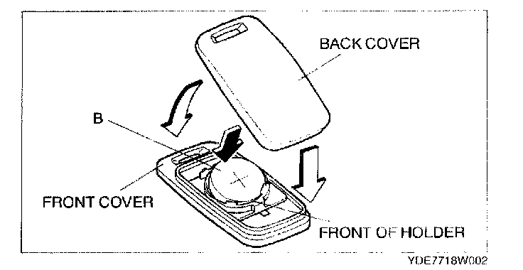 3. Install a new battery (CR2025 or the equivalent) into the front portion of the holder with the positive pole (+) facing up. Press on the B portion of the battery to set the battery.