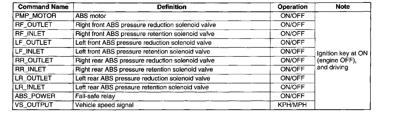 When operating, the ABS motor and each valve forcibly turn ABS POWER on, and then each command on. ABS POWER regulates the power supply for the ABS motor and 8 valves.