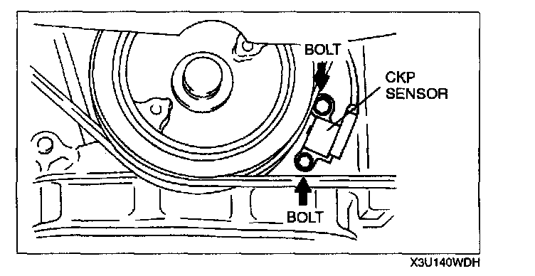 CAUTION: When foreign material such as an iron chip is on the CKP sensor, it can cause abnormal output from the sensor because of flux turbulence and adversely affect the engine control. Be sure there is no foreign material on the CKP sensor when replacing.
