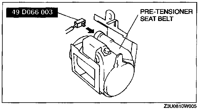 2. Remove the pre-tensioner seat belt and connect the SST (49 D066 003) to it as shown in the figure.