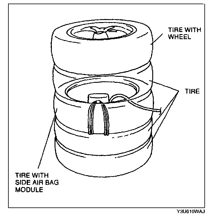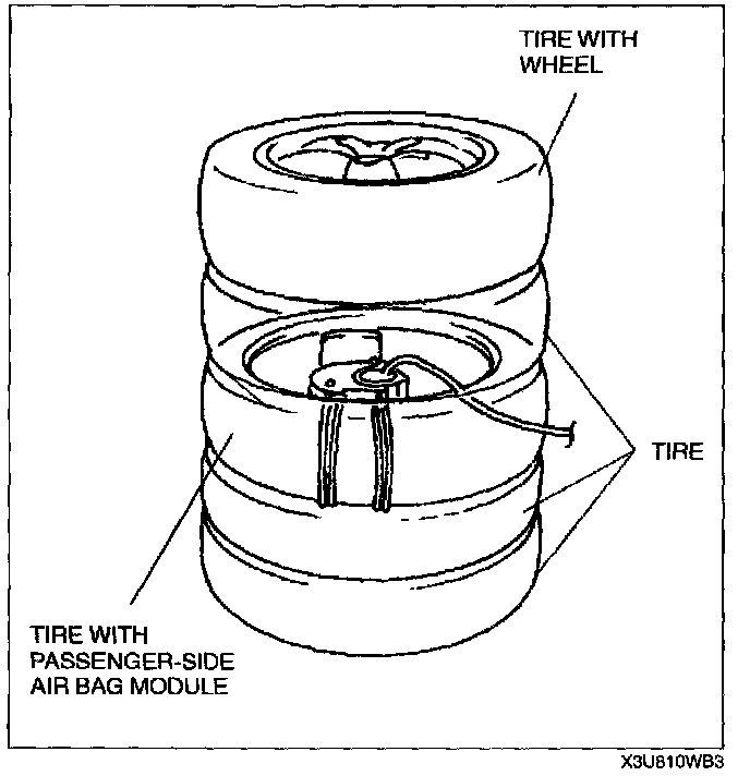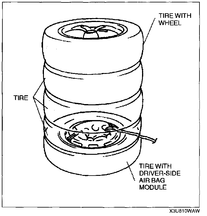 5. Stack the tire with the passenger-side air bag module on top of 2 tires. Stack a tire on top of the 3 tires. Stack another tire that has a wheel on top of the 4 tires.