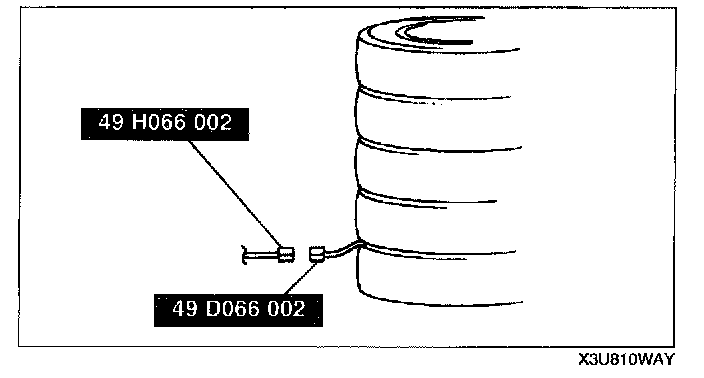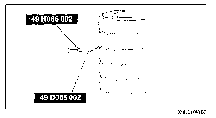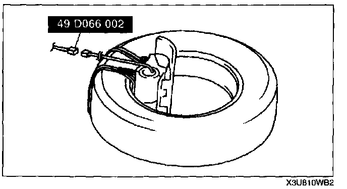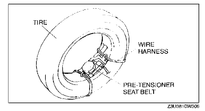 WARNING: If the pre-tensioner seat belt is not properly installed to the tire, serious injury may occur when the pre-tensioner part is deployed. When installing the pre-tensioner seat belt to the tire, make sure the pre-tensioner part is inside the tire.