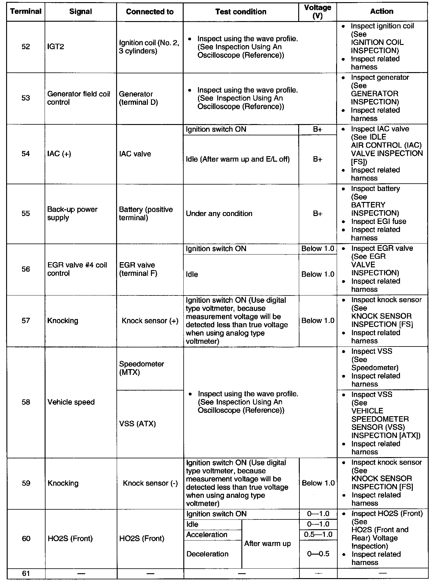 Terminal Voltage Table (Reference) - Terminals (52 - 61):