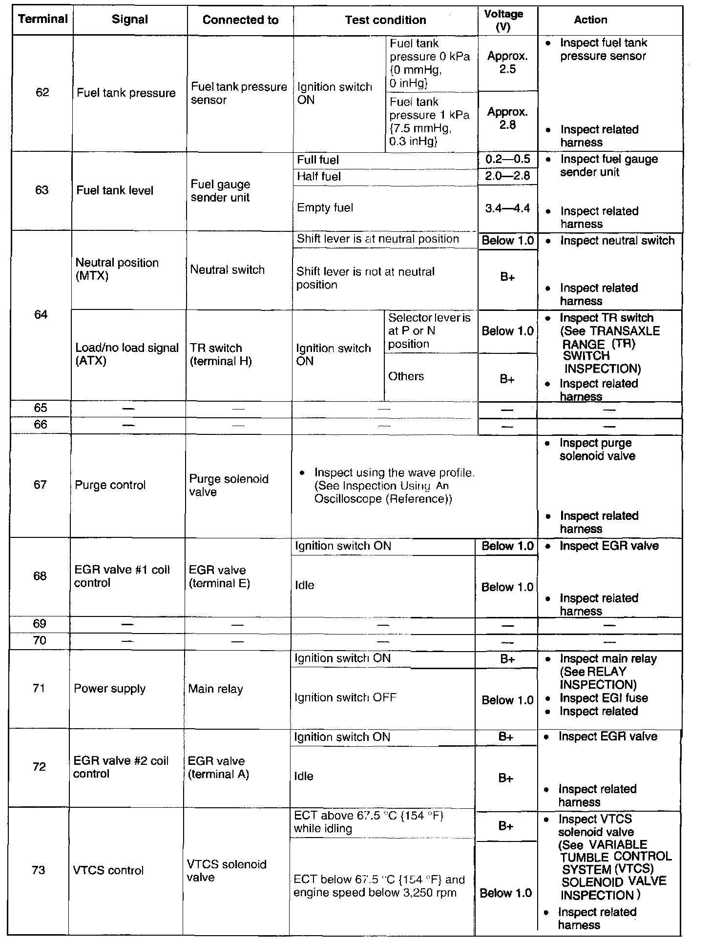 PCM INSPECTIONCAUTION: The PCM terminal voltages vary with change in measuring conditions and vehicle conditions. Always carry out a total inspection of the Input systems, output systems, and PCM to determine the cause of trouble. Otherwise, a wrong diagnosis will be made.