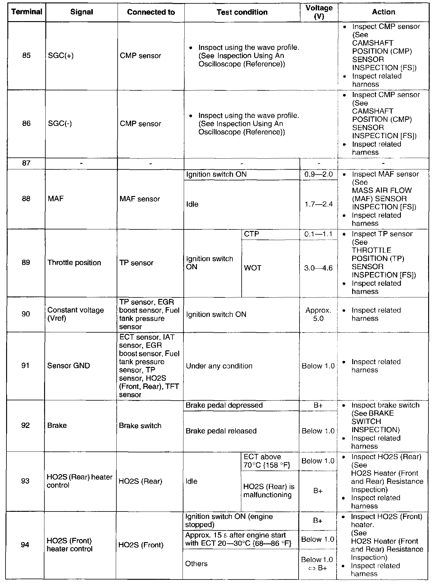 Terminal Voltage Table (Reference) - Terminals (85 - 94):
