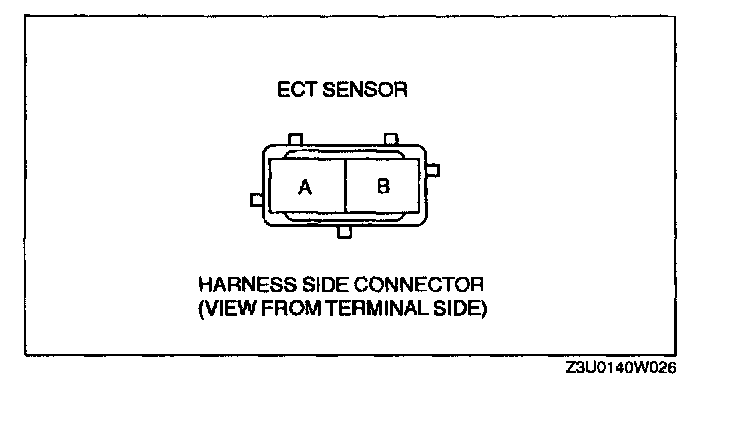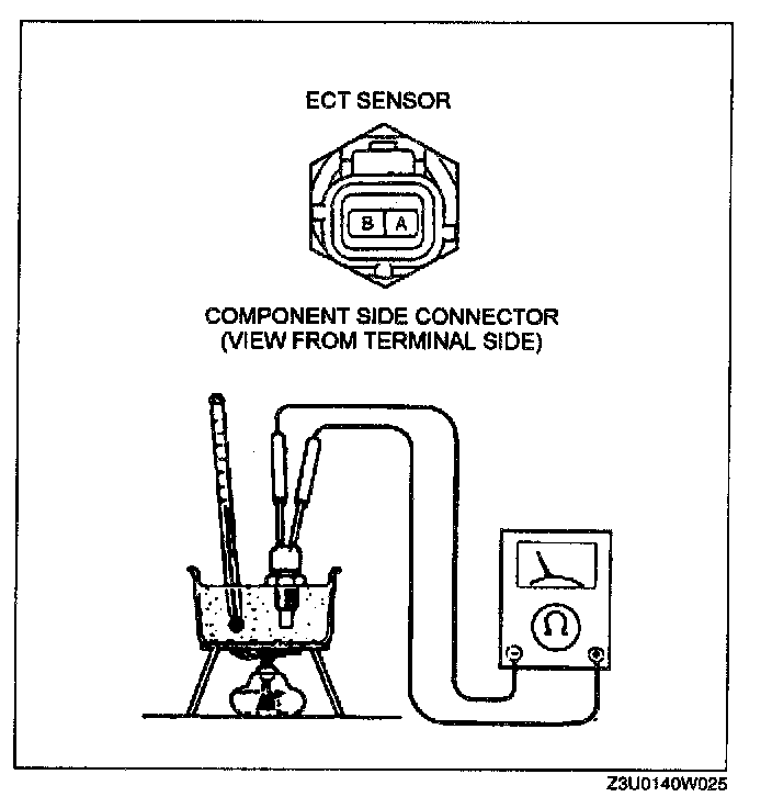 4. Measure the resistance between the ECT sensor terminals A and B using an ohmmeter.
