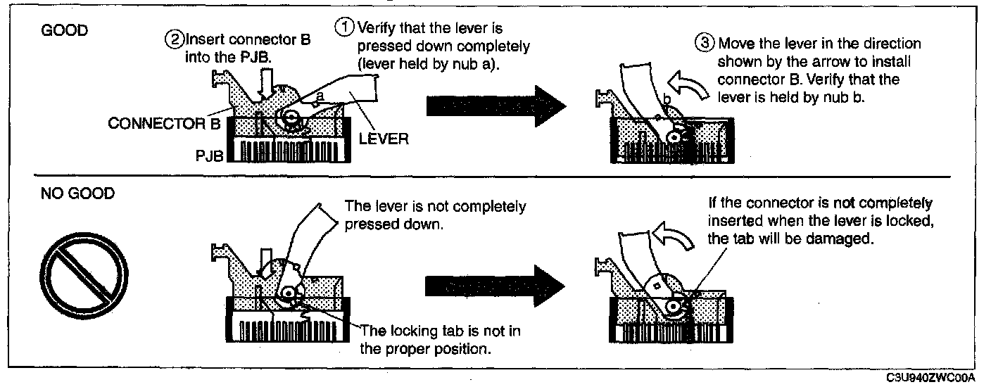 1. Rotate the lever in the direction of the arrow and remove connector B.