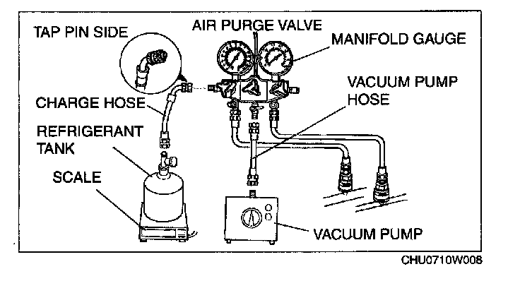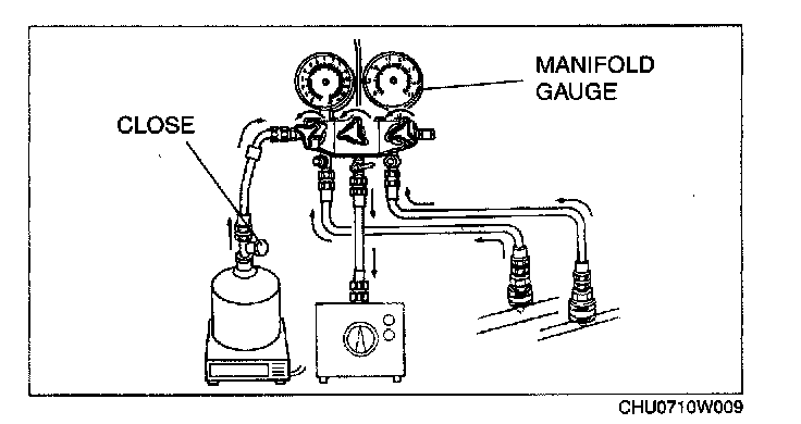 CAUTION: Close the manifold gauge valve immediately after stopping the vacuum pump. If the valve is left open, the vacuum pump oil will flow back into the refrigeration cycle and cause a decrease in the efficiency of the air conditioner.