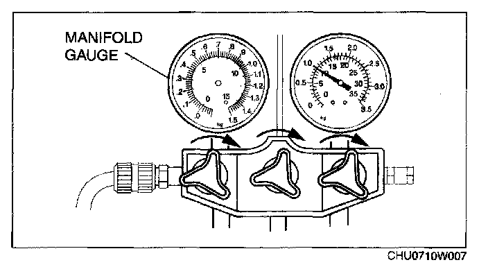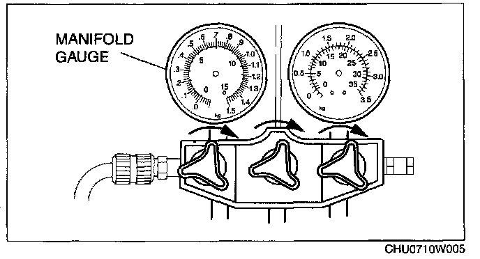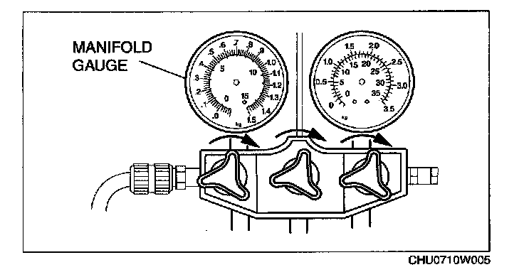 3. Verify that high- and low-pressure side readings of the manifold gauge are at -101 kPa {-760 mmHg, -29.9 inHg}. Close each valve of the manifold gauge.