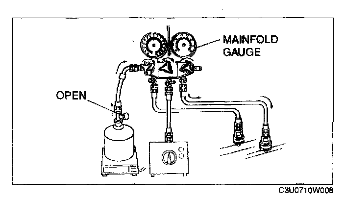 7. Open the high-pressure side valve of the manifold gauge and charge with refrigerant until the weight of refrigerant tank has decreased 238-263 g {8.40-9.28 oz} from the amount in Step 2.