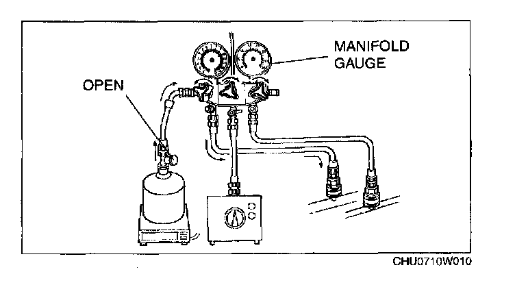 10. Open the low-pressure side valve of the manifold gauge and charge with refrigerant until the weight of the refrigerant tank has decreased regular amount from the amount in Step 2.