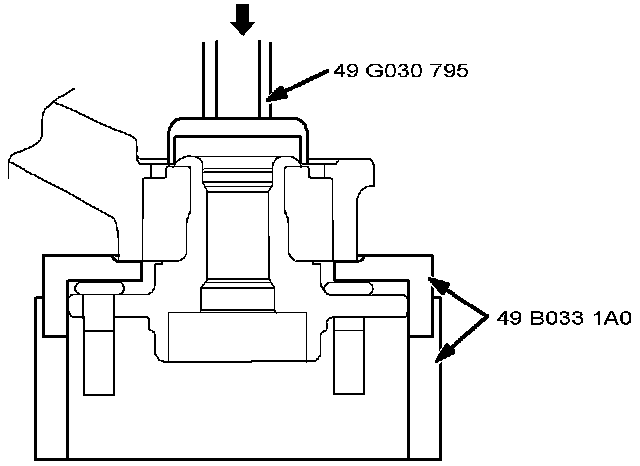 To prevent damaged to the wheel hub component when pressing it down, install the SST to the bearing outer race firmly.